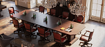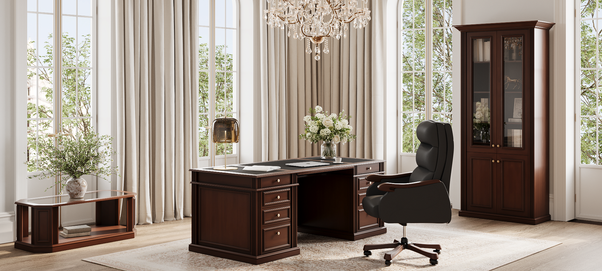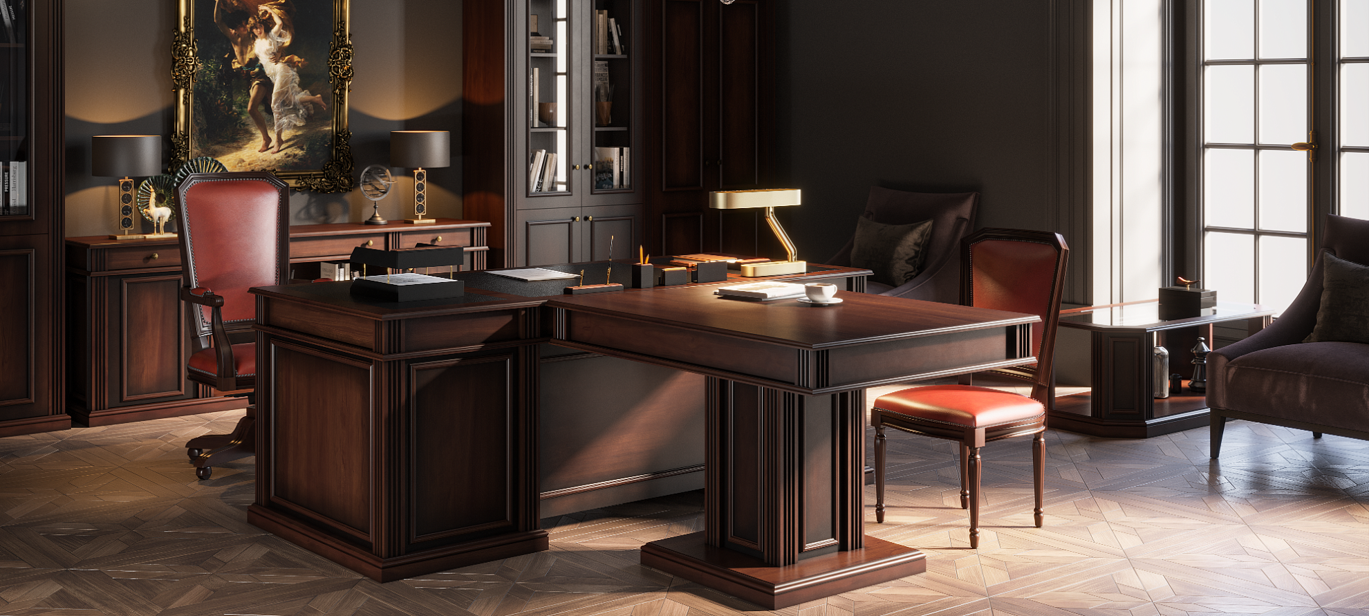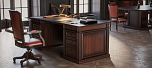 Мебель выполнена из плиты МДФ, облицованной шпоном с декоративными накладками из массива дерева, и из ЛДСП. Элементы, выполненные из МДФ толщиной 25, 17 и 7 мм, облицованной натуральным шпоном бука с тонировкой цвета «орех бреннерский», патиной декоративных элементов и гладким сатиновым покрытием износостойким лаком.