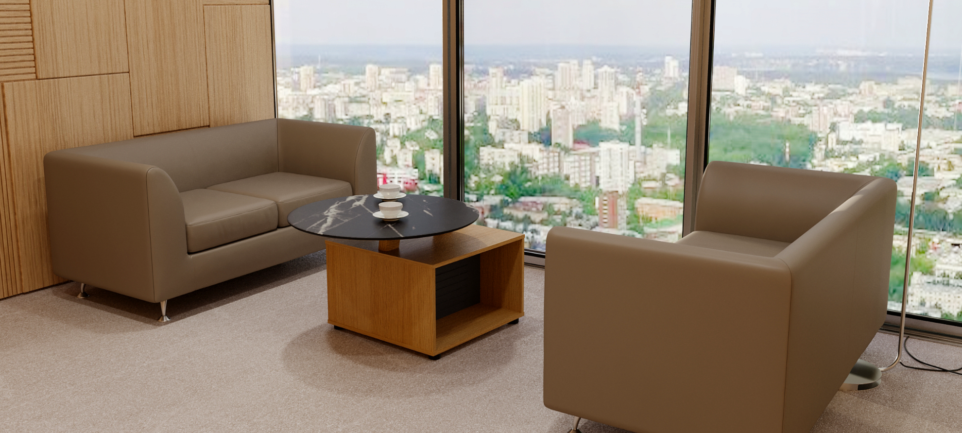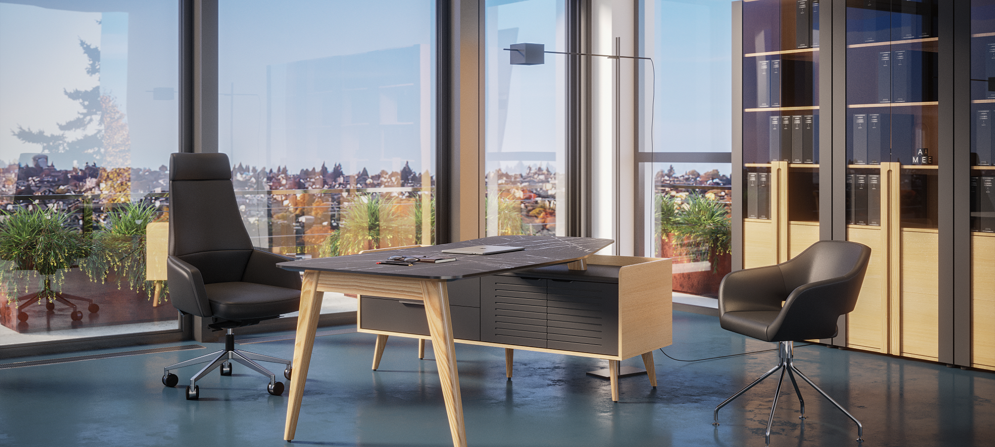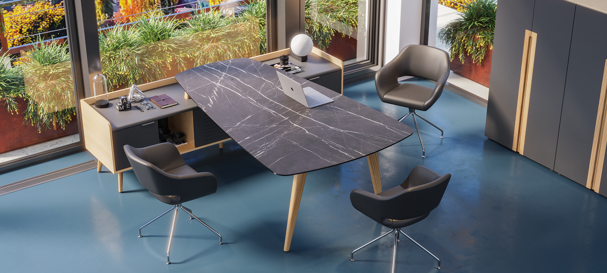 Мебель выполнена из плит МДФ, из массива дерева и ЛДСП. Толщина столешницы: 25 мм. Остальные элементы мебели выполнены из МДФ, облицованной ПВХ пленкой цвета «графит» или «серый софт». Мебель выпускается в двух цветовых вариантах: HPL-пластик «мрамор черный» в сочетании с ЛДСП цвета «дуб Сорано» и декоративной облицовкой элементов ПВХ-пленкой цвета «графит»; HPL-пластик «мрамор белый» в сочетании с ЛДСП цвета «дуб Сорано» и декоративной облицовкой элементов ПВХ-пленкой цвета «серый софт».