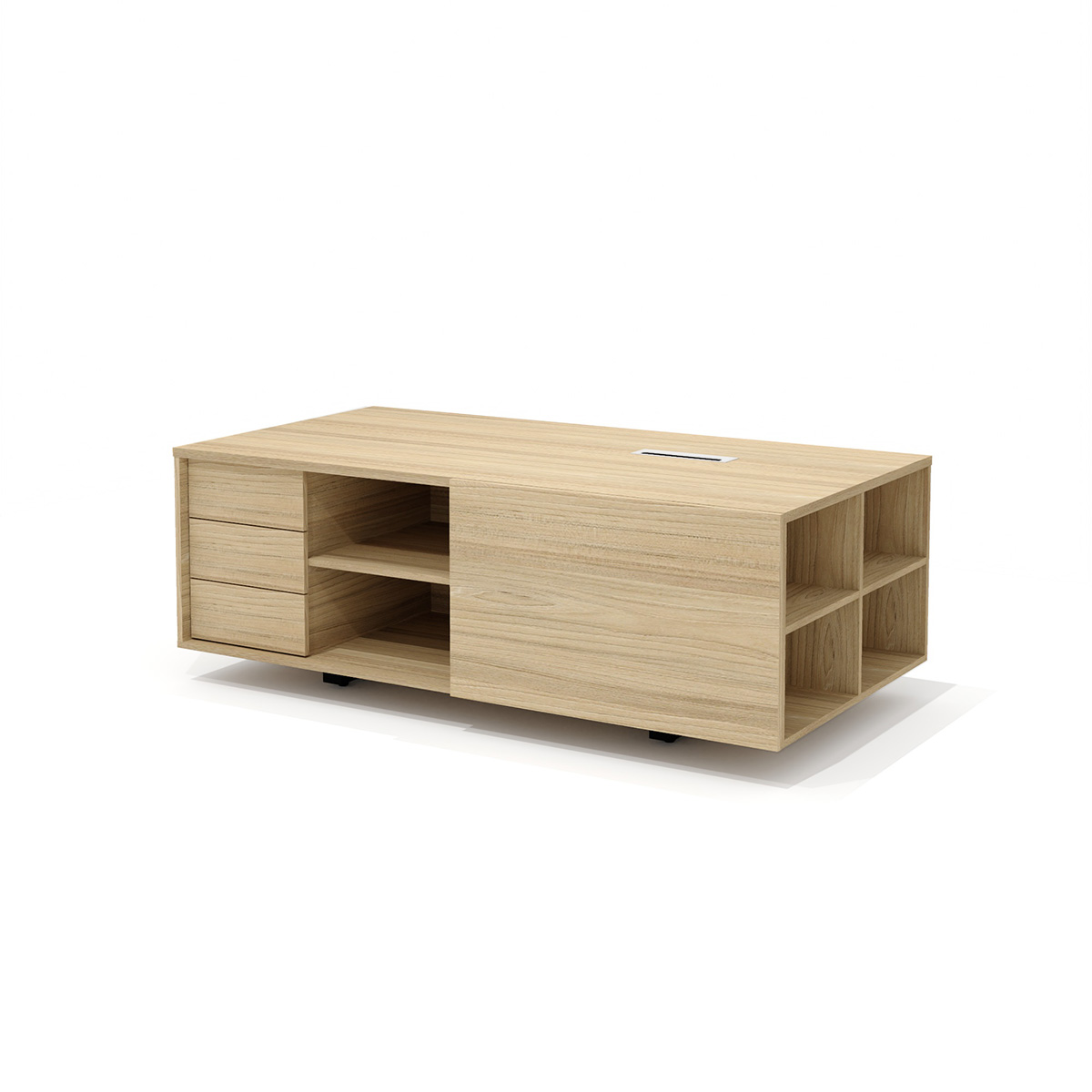 На нашей выставке, на Океанском проспекте, представлен прямой широкий стол в цвете швейцарский вяз с металлической опорами в цвете «Черный матовый», который установлен на сервисную тумбу. Прямой стол в сочетании с сервисной тумбой соответствует эргономике. Необходимая для ежедневной работы тумба находится на расстоянии вытянутой руки, что считается наиболее удачным расположение мебели. Сервисная тумба это вместительная и удобная тумба для вашего офиса. Используется для хранения офисных принадлежностей и бумаг, оргтехники.