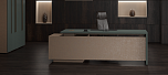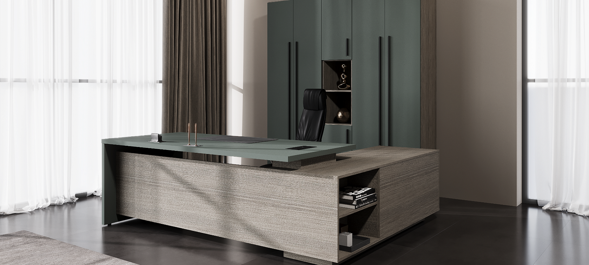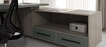 Основной материал: МДФ с покрытием EVOSOFT, ЛДСП (EGGER) Столешницы: МДФ 36 мм Опоры столов: МДФ 36 мм Тумбы-опоры: ЛДСП 18 мм, фасады МДФ 18 мм Каркасы шкафов и тумб: ЛДСП 18 мм, задняя стенка – ЛДСП; высота шкафов 2200 мм Дверцы шкафов: МДФ 18 мм / стекло в раме в цвет основного металла. Двери шкафов комплектуются петлями с доводчиком Стеллаж с горизонтальными слайд-дверьми: бесшумное скольжение Лицевая фурнитура: металлические ручки 220 мм, 350 мм, 1200 мм Подсветка: LED-лента Розеточный блок: беспроводная зарядка, розетка 220В, USB Направляющие: телескопические (шариковые) плавного хода с доводчиками