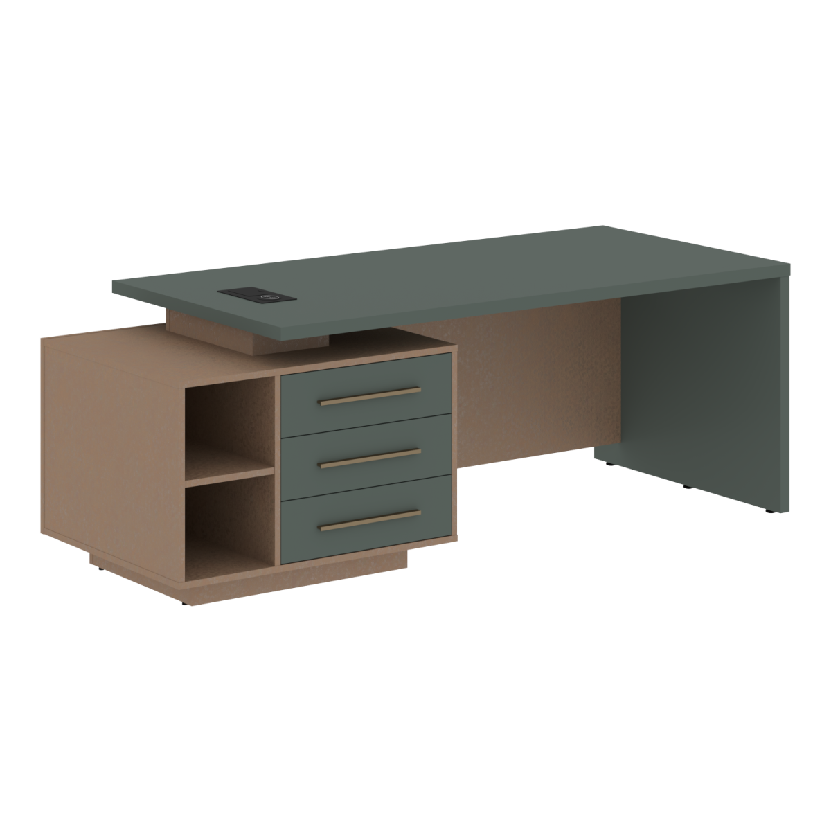 Столешница, опора выполнены из МДФ т.36мм с покрытием пленкой PET(ПЭТ), с кромками ПВХ т.2мм. Опорная тумба габаритом 903х749х546, каркас из ЛДСП т.18мм, видимые кромки ПВХ т.1мм, фасады ящиков вкладные из МДФ т.18мм в пленке PET(ПЭТ), комплектуются ручкой с межцентровым расстоянием 320мм. Ящики-фолдинги разборные 520,5х400х100мм, направляющие - шариковые с доводчиком. Фронтальная панель стола и каркаса тумбы общая, h=548мм. Для увеличения жесткости стола под столешницей установлена металлическая траверса. В столешнице встраиваемый розеточный блок AE-PB1SAVAP-20, цвет - черный, 2 порта USB A+C, индукционная зарядка 5W с проводом 1,5 метра.