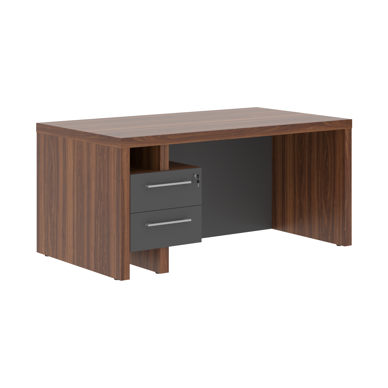 Стол с встроенной тумбой. Столешница и опоры из ЛДСП т.54 мм, кромка ПВХ т.1мм. Фронтальная панель до пола H=600 мм. Стол комплектуется регулируемыми опорами. Каркас тумбы из ЛДСП т.18 мм, ящикифолдинги, центральный замок.