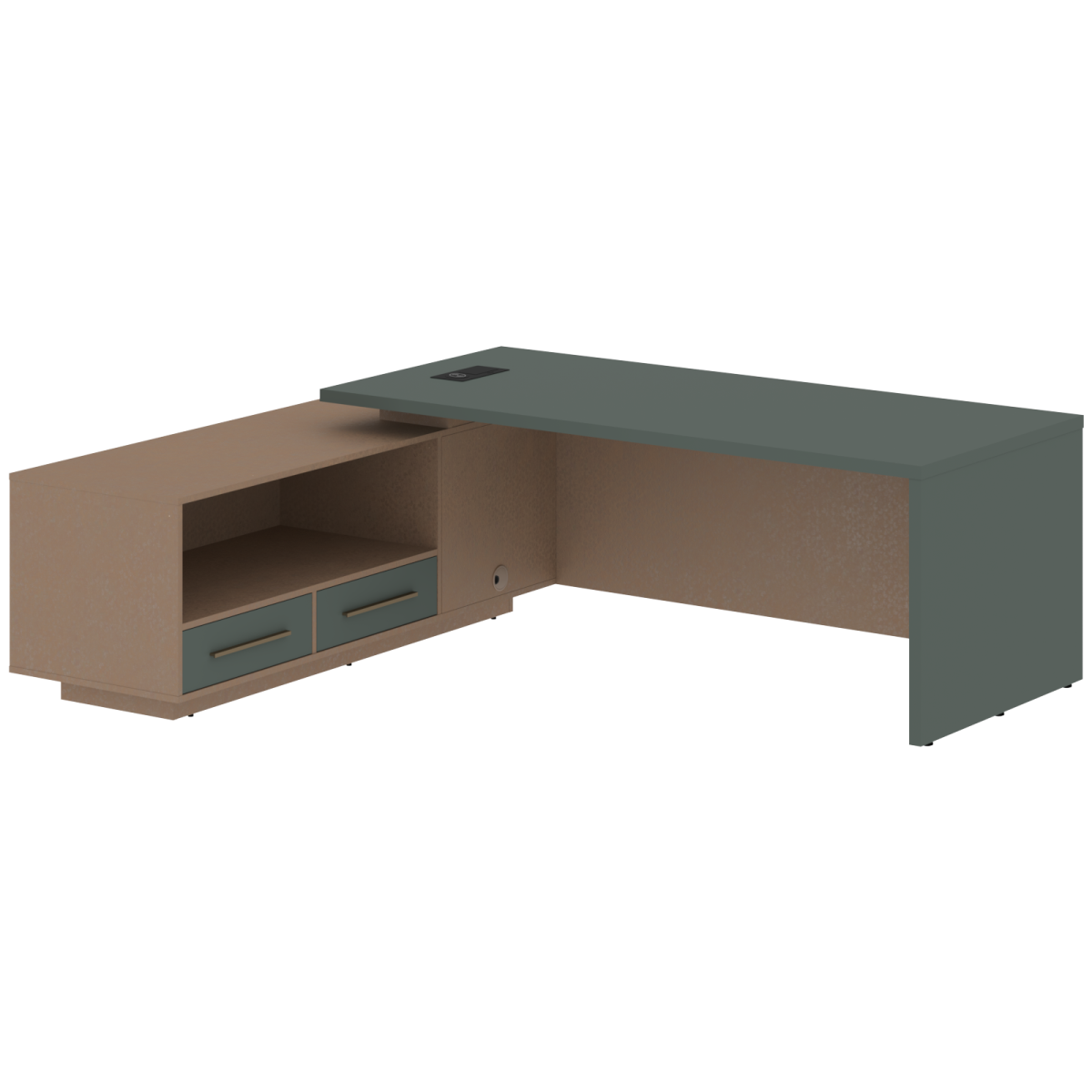 Столешница, опора выполнены из МДФ т.36мм с покрытием пленкой PET(ПЭТ), с кромками ПВХ т.2мм. Опорная тумба габаритом 1779х600х546, каркас из ЛДСП т.18мм, видимые кромки ПВХ т.1мм, фасады ящиков вкладные из МДФ т.18мм в пленке PET(ПЭТ), комплектуются ручкой с межцентровым расстоянием 320мм. Ящики-фолдинги разборные 520,5х400х100мм, направляющие - шариковые с доводчиком. Фронтальная панель стола и каркаса тумбы общая, h=548мм. Для увеличения жесткости стола под столешницей установлена металлическая траверса. В столешнице встраиваемый розеточный блок AE-PB1SAVAP-20, цвет - черный, 2 порта USB A+C, индукционная зарядка 5W с проводом 1,5 метра.