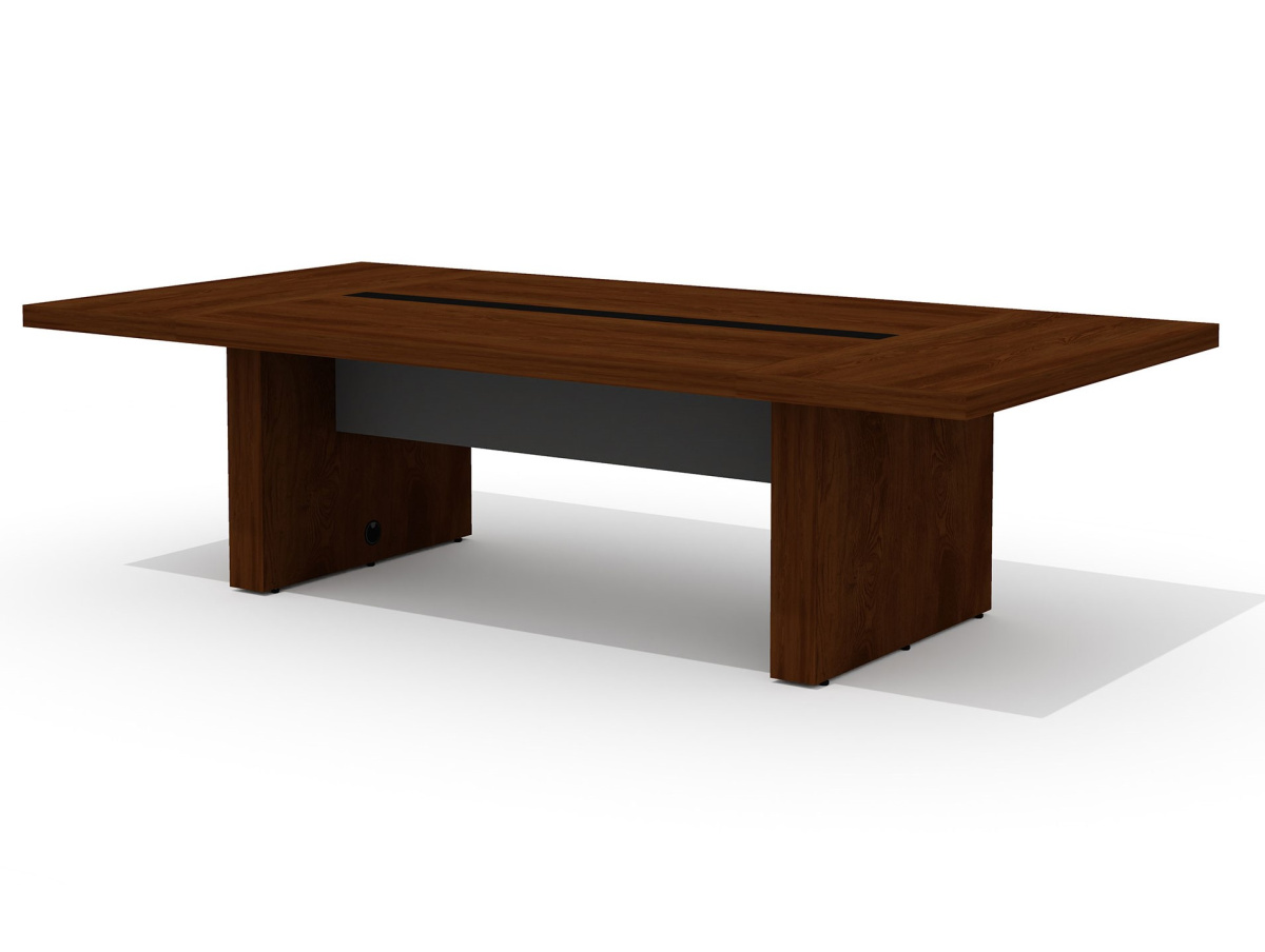 Стол для переговоров состоит из двух столешниц размером 1680х700 мм и двух объединяющих приставок размером 1400х560 мм, установленных на подстолье из двух опор и двух параллельных царг, проходящих между ними. Опоры выполнены в виде коробов шириной 900 мм и визуальной толщиной 120 мм. Подстолье оснащено кабель-каналом с возможностью прокладки кабелей подключения оргтехники под столешницами с выводом в полость опор. Внутренние габариты кабель-канала – 1560х270х145 мм. Для дальнейшего подключения кабелей оргтехники к источнику питания, в каждой опоре предусмотрены декоративные поворотные заглушки.