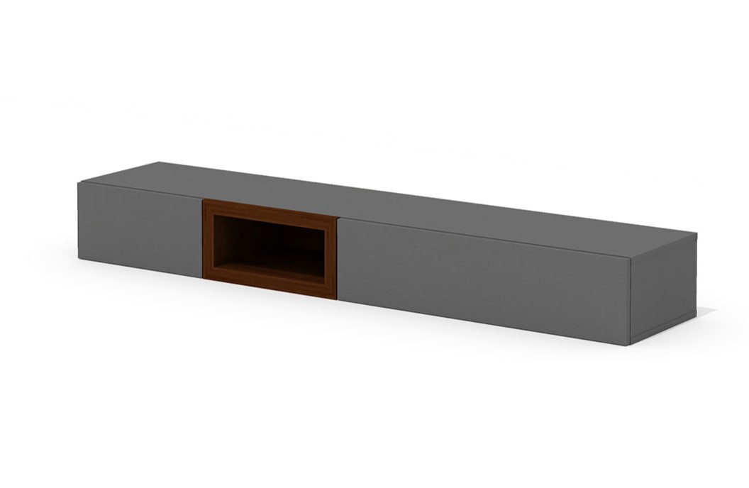 Внутреннее пространство корпуса полки разделено двумя перегородками на три отделения. Центральное отделение полки шириной 370 мм заполнено шпонированным модулем, выполненным в виде низкой открытой ниши с накладной рамкой шириной 34 мм по периметру лицевой стороны. Боковые отделения шириной 388 и 776 мм оснащены выдвижными ящиками, установленными на скрытые шариковые направляющие с системой открывания «push-to-open». Широкий ящик дополнительно оснащен штангой для синхронизации движения направляющих.