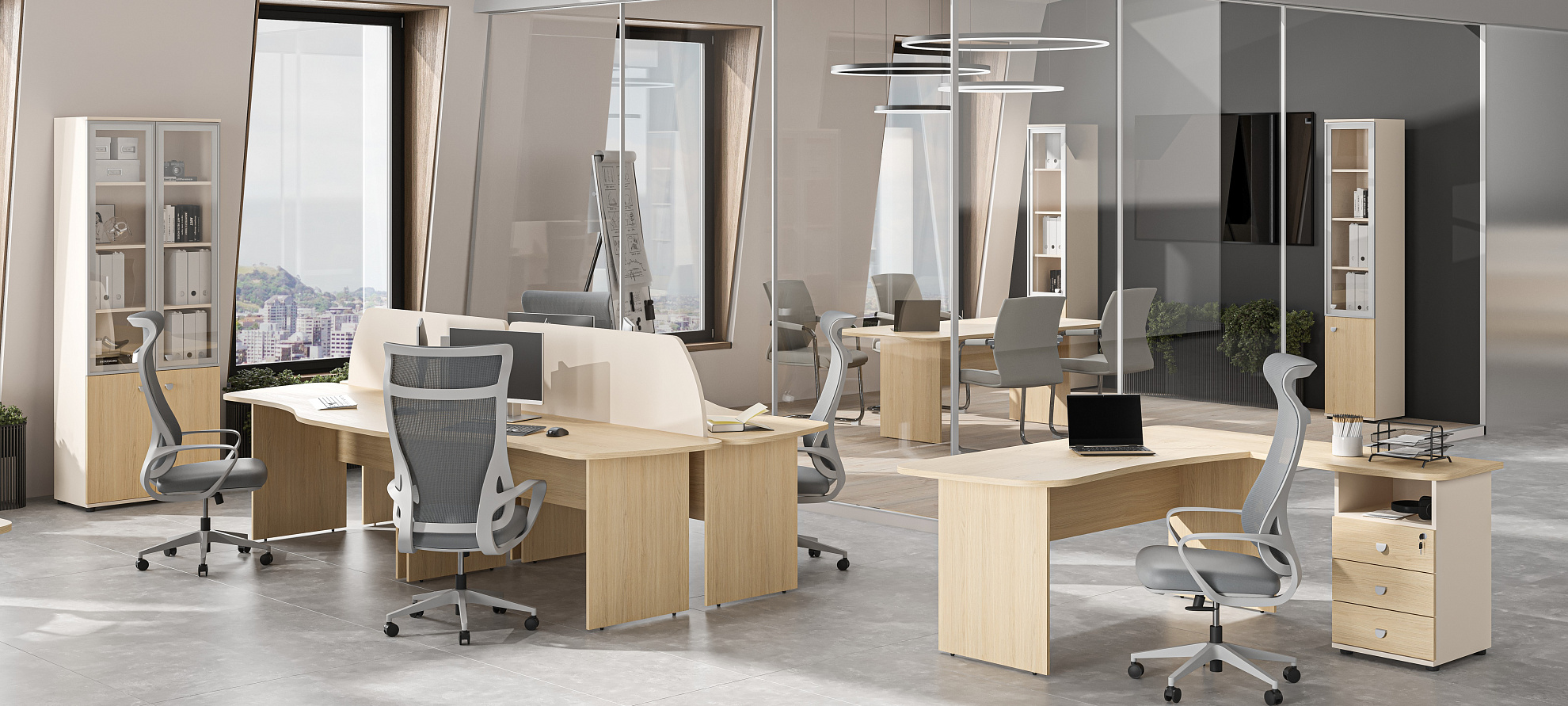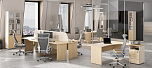 Для удобства сотрудников предусмотрена разнообразная система хранения: тумбы, шкафы, комоды и стеллажи. Все элементы выполнены в одном стиле и сочетаются между собой, создавая целостное впечатление даже при масштабной комплектации офиса. Эргономика мебели отвечает современным стандартам — оптимальная высота рабочих поверхностей, плавное открывание ящиков, безопасная фурнитура. Используемые материалы устойчивы к истиранию и загрязнениям, что гарантирует долгий срок службы.