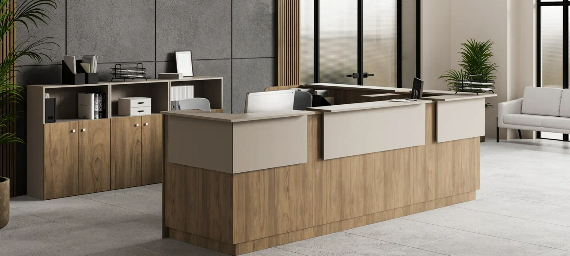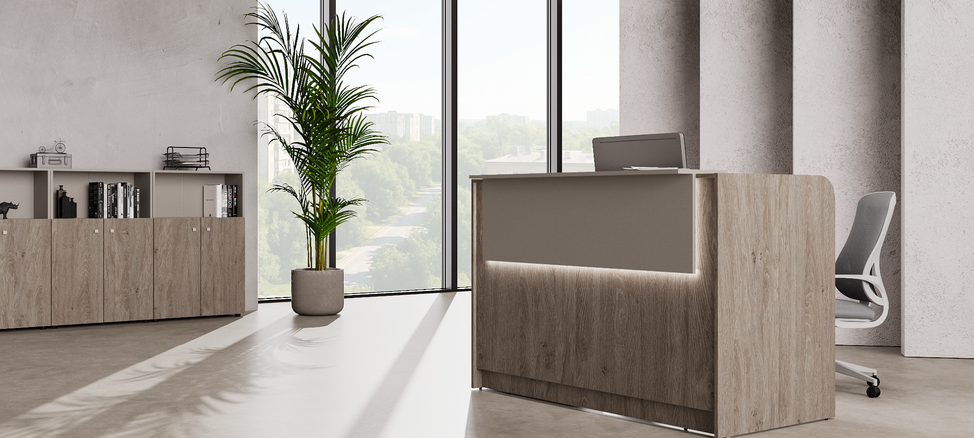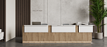 Стойка ресепшен Rio Reception — это безупречный дизайн и максимальную функциональность, продуманность и рациональность. Сочетание приглушённого цвета «беж» с древесными текстурами позволяют создать приёмную в современном стиле. Rio Reception выполняется в единой концепции с сериями Rio Base , «Rio Direct и Rio System , поэтому гармонично сочетается с элементами этих коллекций, поддерживая единое стилевое решение и основной принцип всей линейки Rio