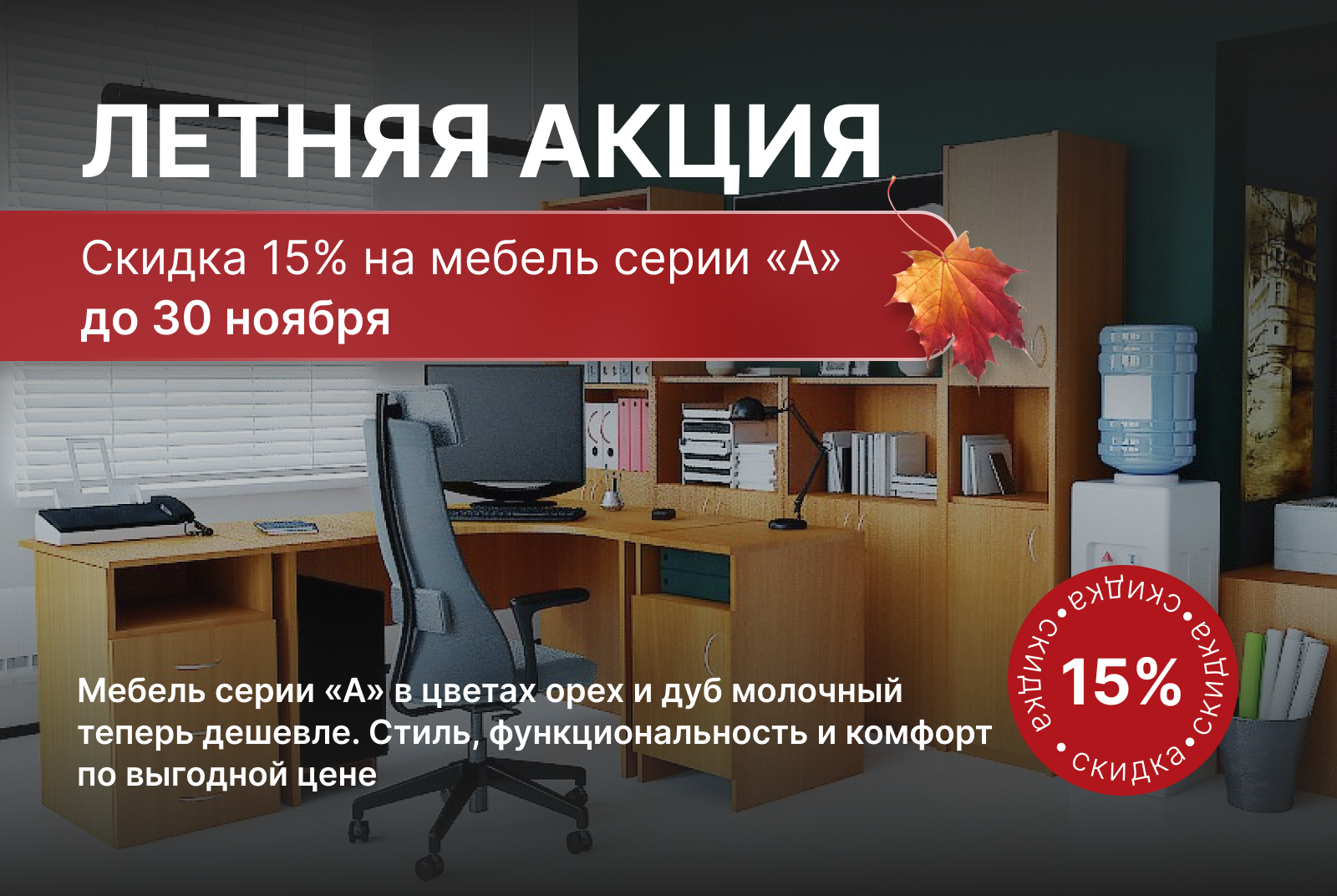 Скидка распространяется на мебель серии "А" в цвете "ОРЕХ" и "ДУБ МОЛОЧНЫЙ", которая есть в наличии на складе или в выставочном зале компании!